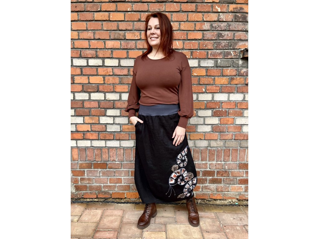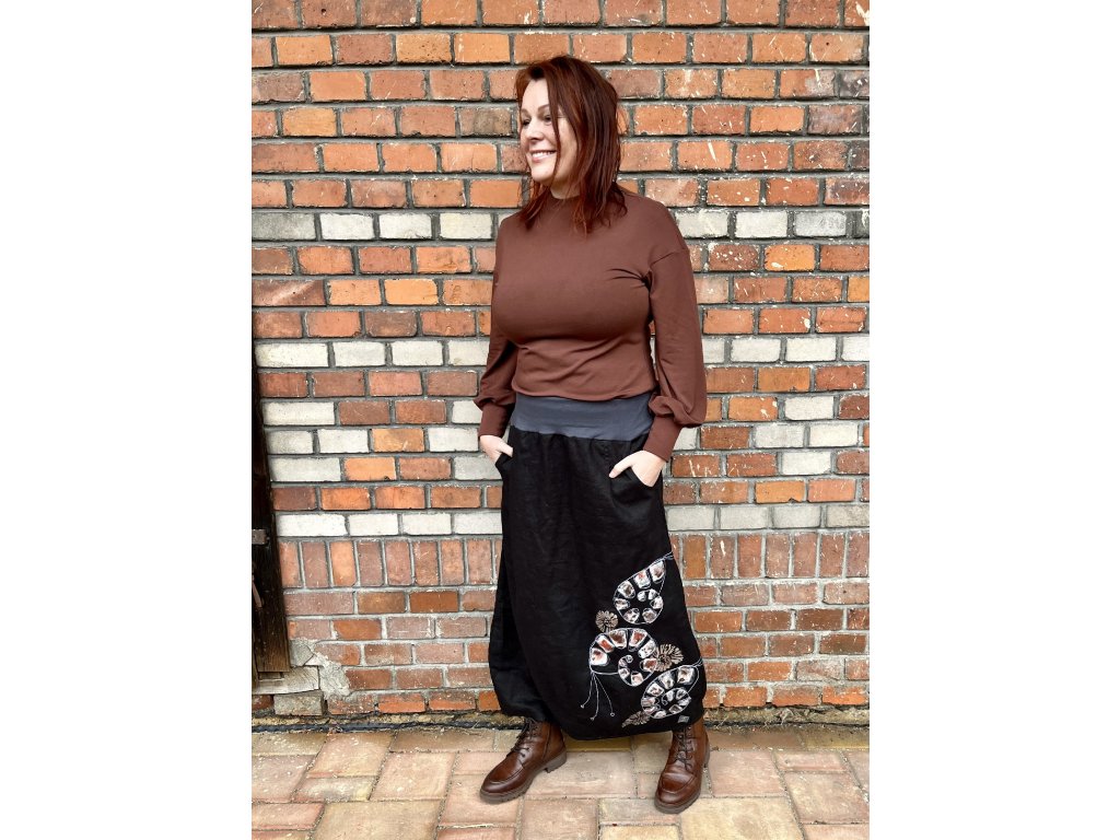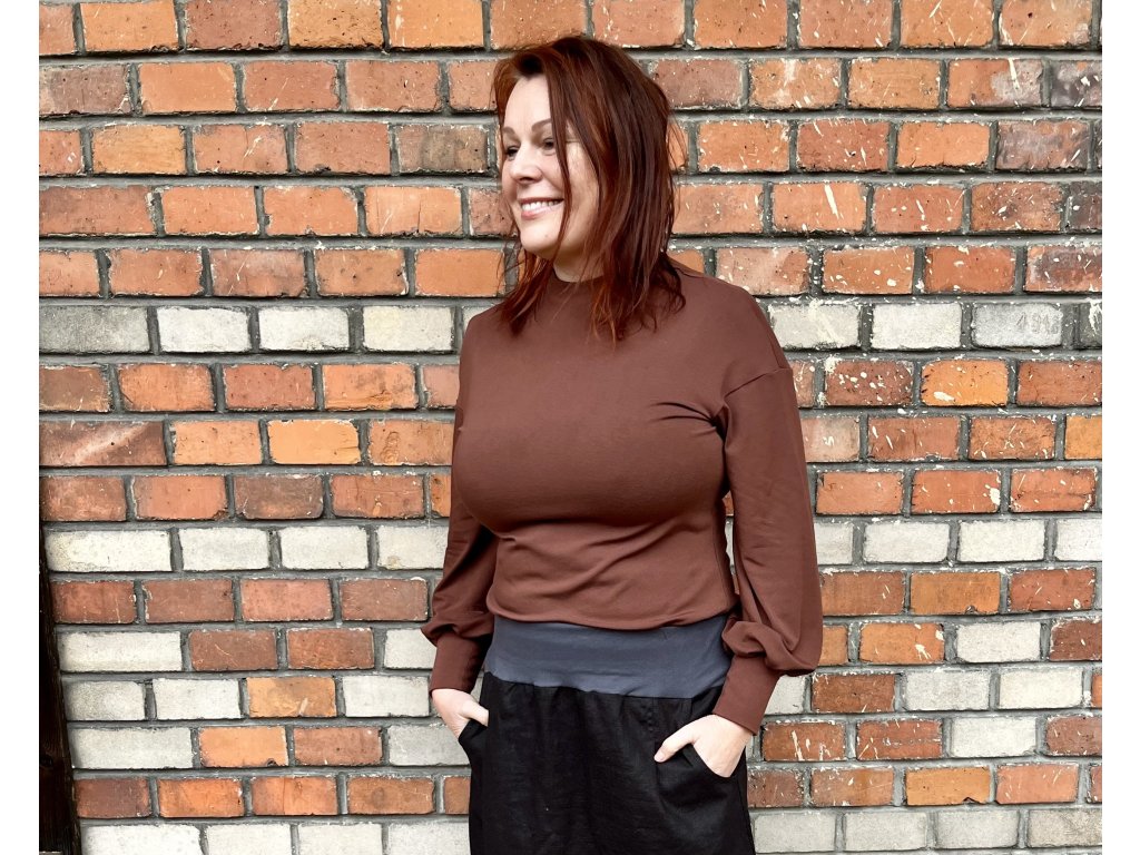 Hnědá halenka z bambusové viskózy jemně splývá a v nabíraných rukávech nese tichý pohyb.
