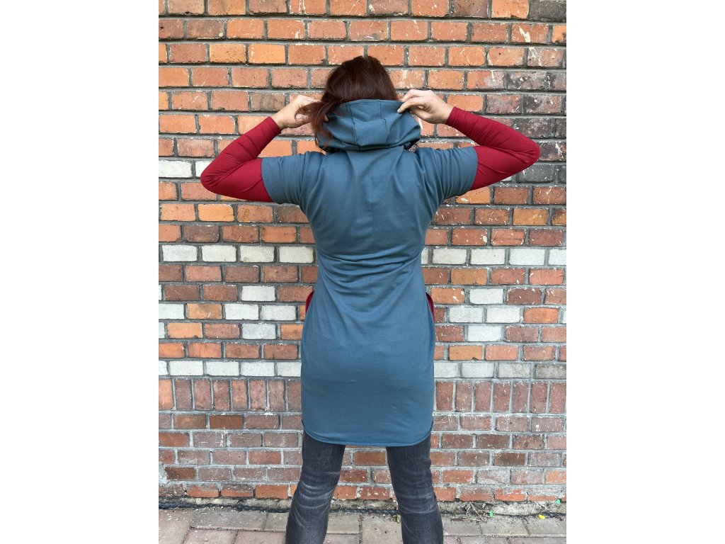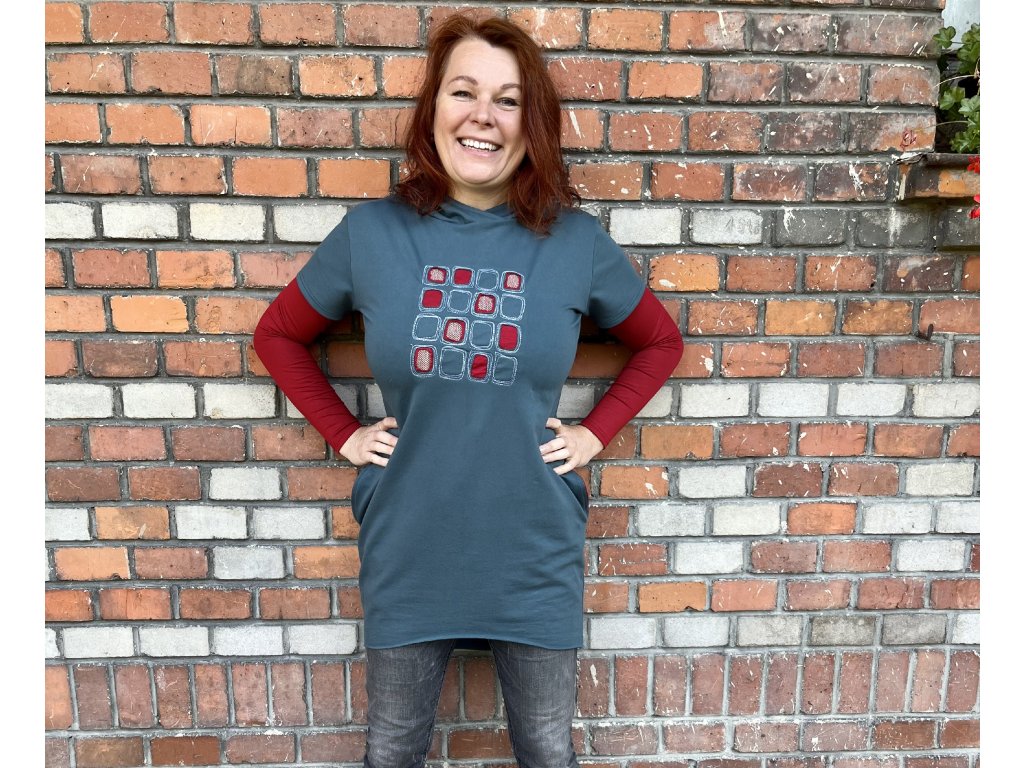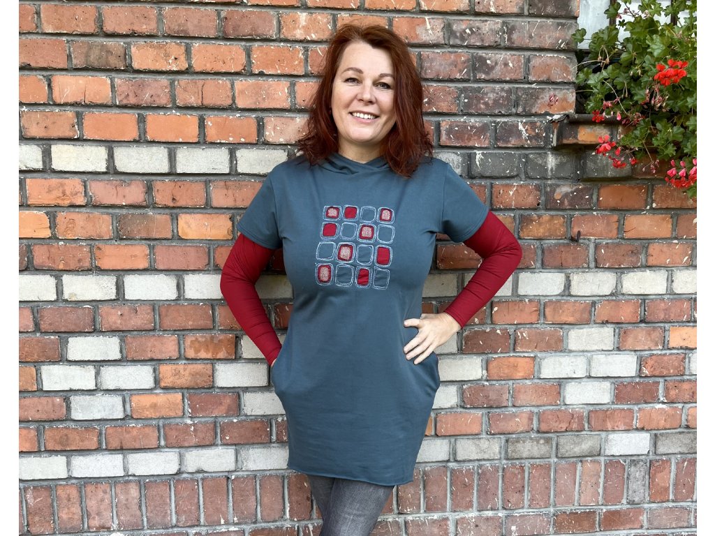 Petrolejové mikinošaty s krátkým rukávem a autorskou prořezávanou aplikací.