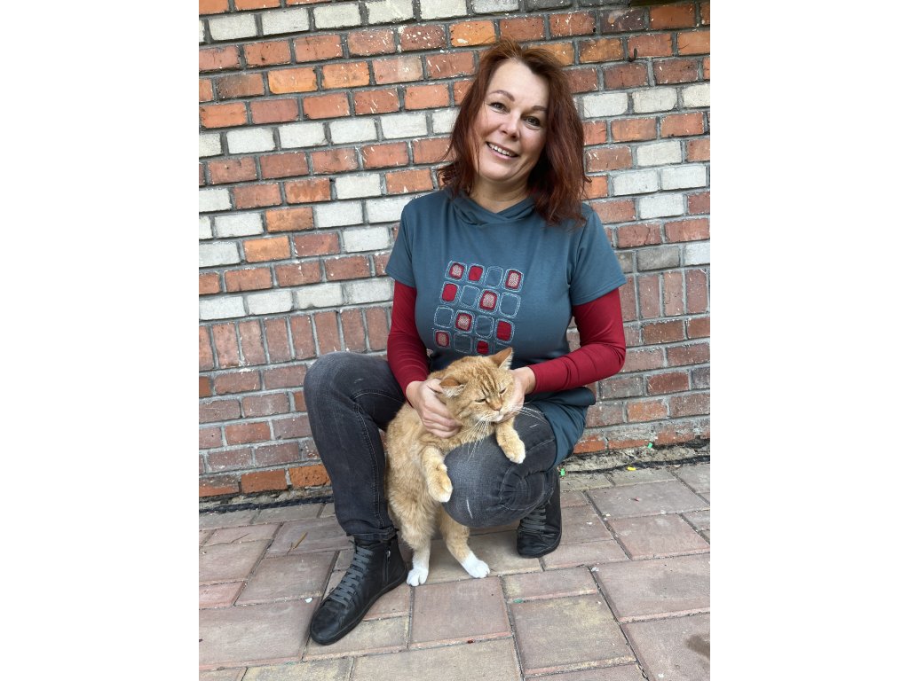 Ušity z české elastické teplákoviny a bambusové viskózy. Červené tričko není součástí modelu, ale můžete si ho společně objednat s mikinou. (680,-)