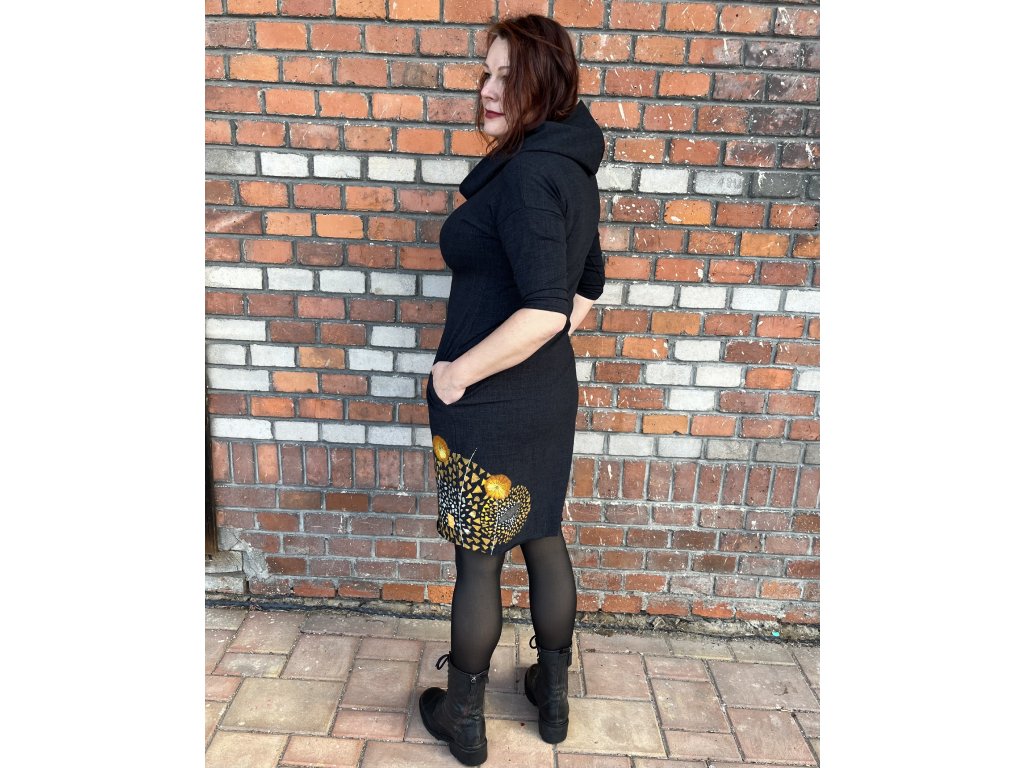 Šaty zdobí plitká kapuce připomínající šálu, která jim dodává originální vzhled.