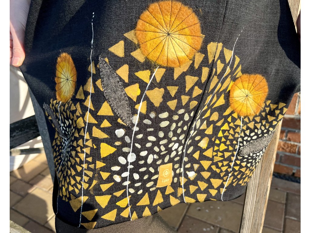 Spodní část je v levém rohu potištěná a ozdobená zplstěnými a prošívanými pampeliškami, což vytváří jedinečný detail.