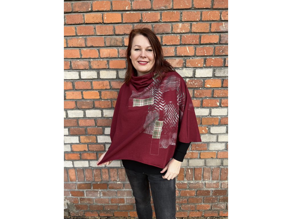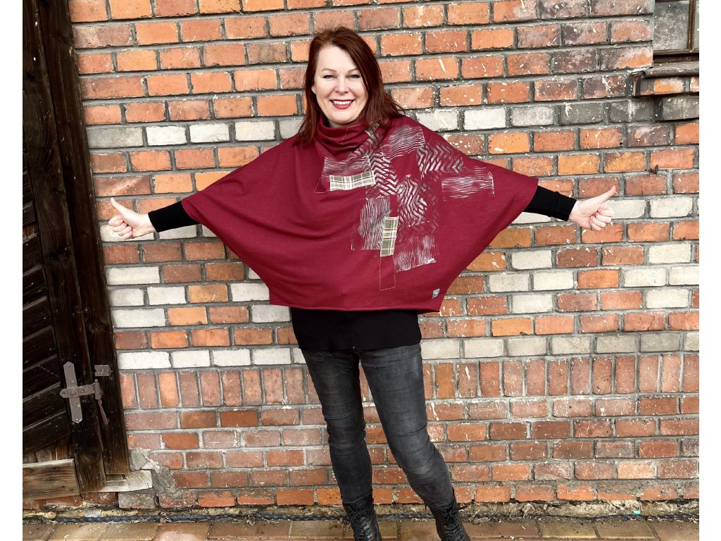 Originální pončo v hlubokém vínovém odstínu je nepřehlédnutelným kouskem pro ženy, které chtějí vyniknout. Volný, pohodlný střih krásně splývá a lichotí postavě, zatímco autorský potisk a textilní aplikace dodávají modelu osobitý umělecký charakter.